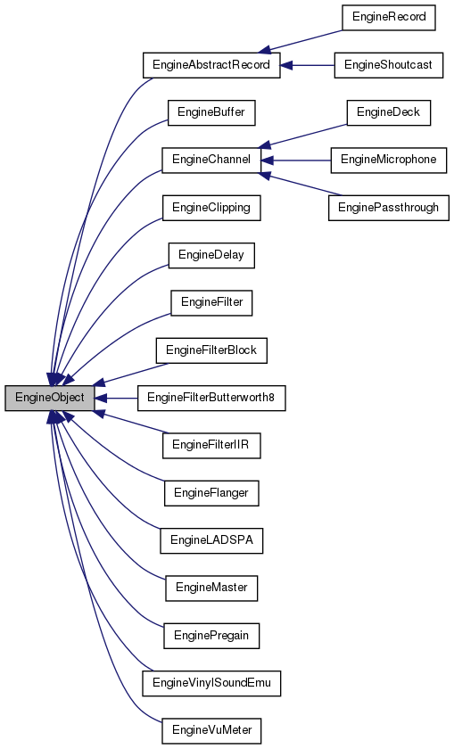 Implemented in EngineBuffer, EngineChannel, EngineClipping, EngineDeck, EngineDelay, EngineFilter, EngineFilterBlock, EngineFilterButterworth8, EngineFilterIIR, EngineFlanger, EngineLADSPA, EngineMaster, EngineMicrophone, EnginePassthrough, EnginePregain, EngineShoutcast, EngineVinylSoundEmu, EngineVuMeter, and EngineRecord.